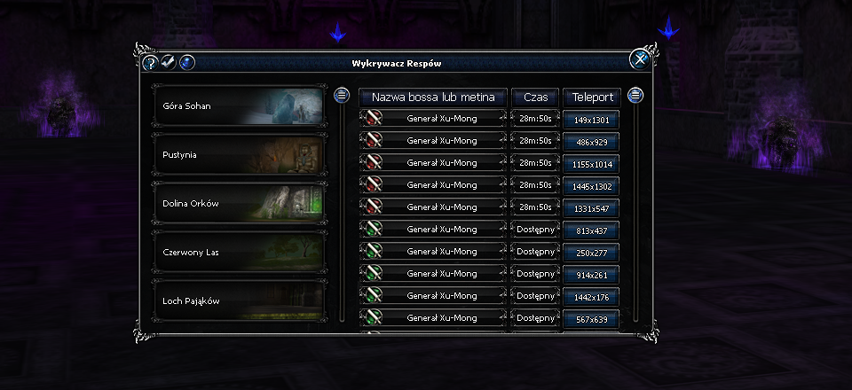 czas startu respów oraz informacje o występowaniu danego bossa.